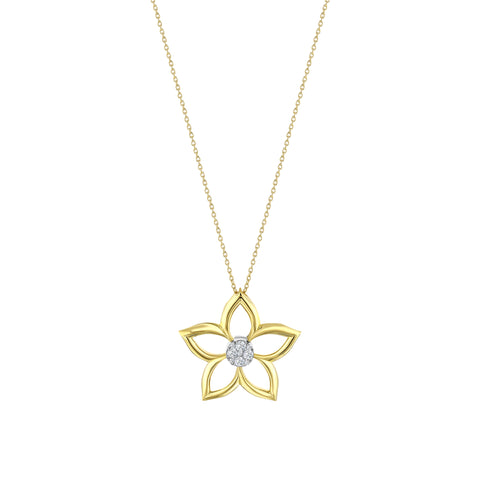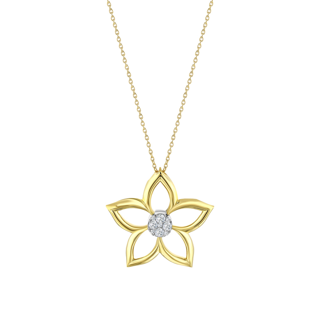 A gracefully scaled floral pendant in yellow gold with an open petal design, centered by a single brilliant-cut natural diamond—an elegant expression of simplicity and grace.