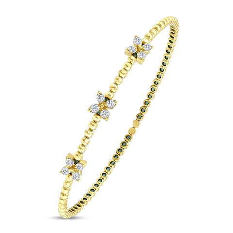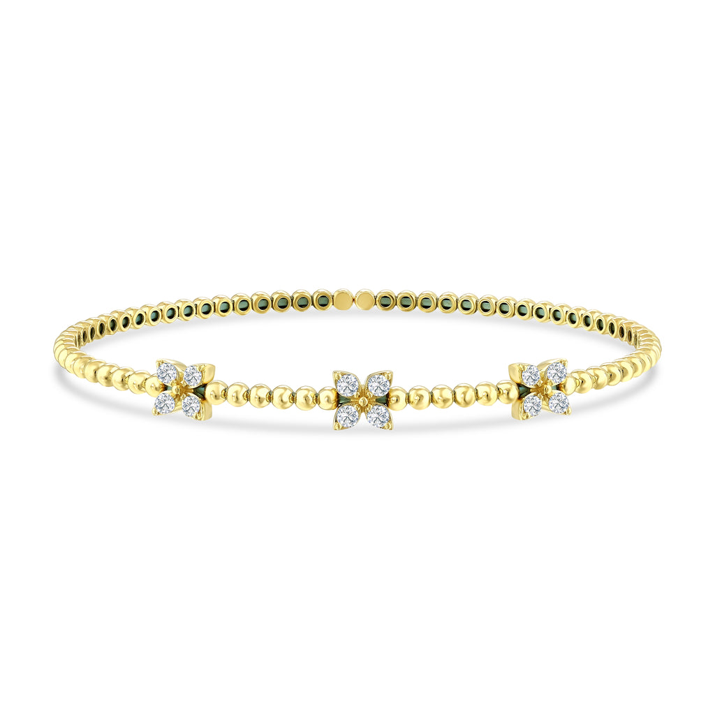 ace meets geometry in this exquisite beaded gold bangle, featuring three delicate floral motifs made of brilliant-cut diamonds. With 12 diamonds totaling 0.48 carats, this 14K gold piece adds symmetrical sparkle to any stack—or makes a graceful statement on its own. Lightweight, elegant, and timelessly feminine.